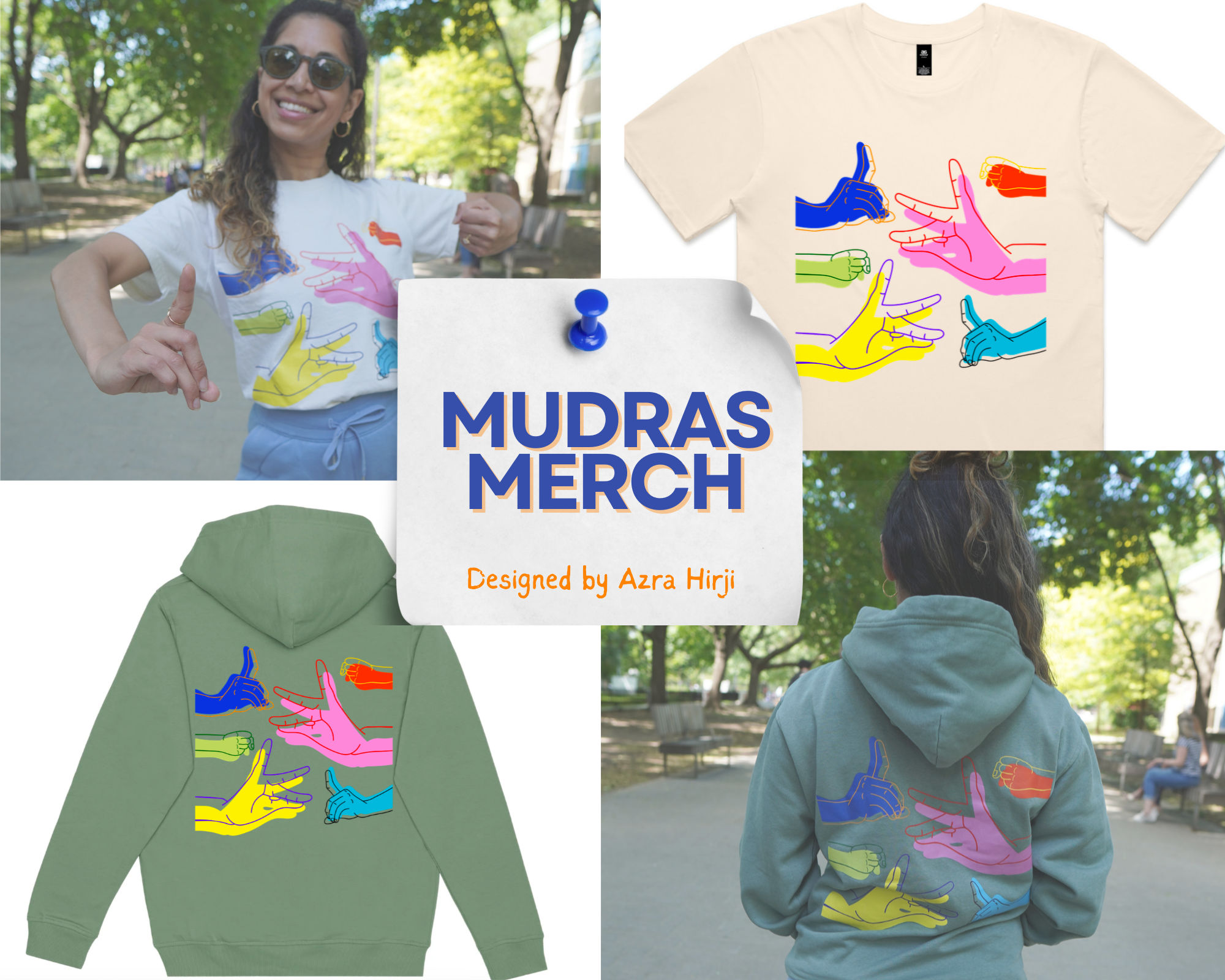 Mudras (hand gestures) are an essential part of Indian dance and are used to convey emotions and tell stories. The very talented Azra Hirji designed our beautiful mudras tee and hoodie.